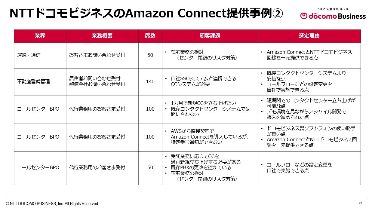 NTTドコモビジネスからAmazon Connect/Your Connectをご提供した事例を一部ご紹介いたします。